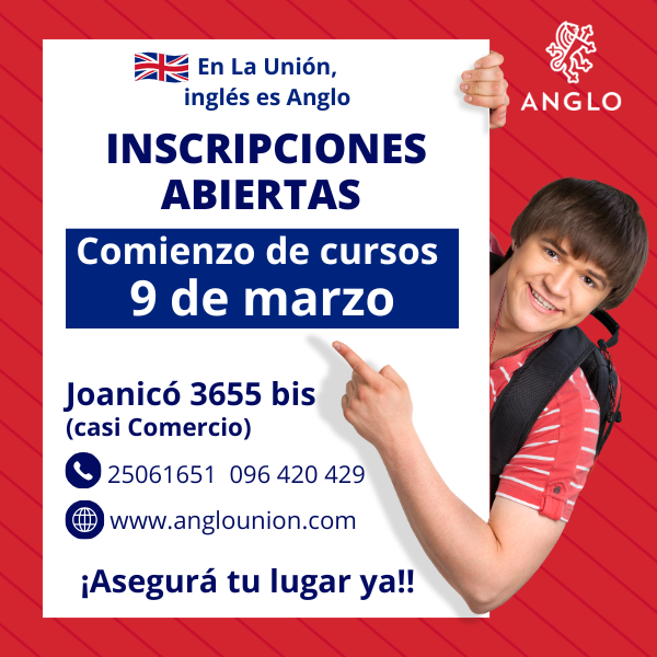esq. Comercio - Tel.: 25061651 - 096420429 (Administrativo) - 097982747 (Académico) email:anglo.union@anglo.edu.uy Atención al público: Lunes, martes y miércoles de 9:00 a 11:30 y de 14:00 a 18:30 jueves sólo de 14:00 hs. a 18:30 hs. Viernes: cerrado |